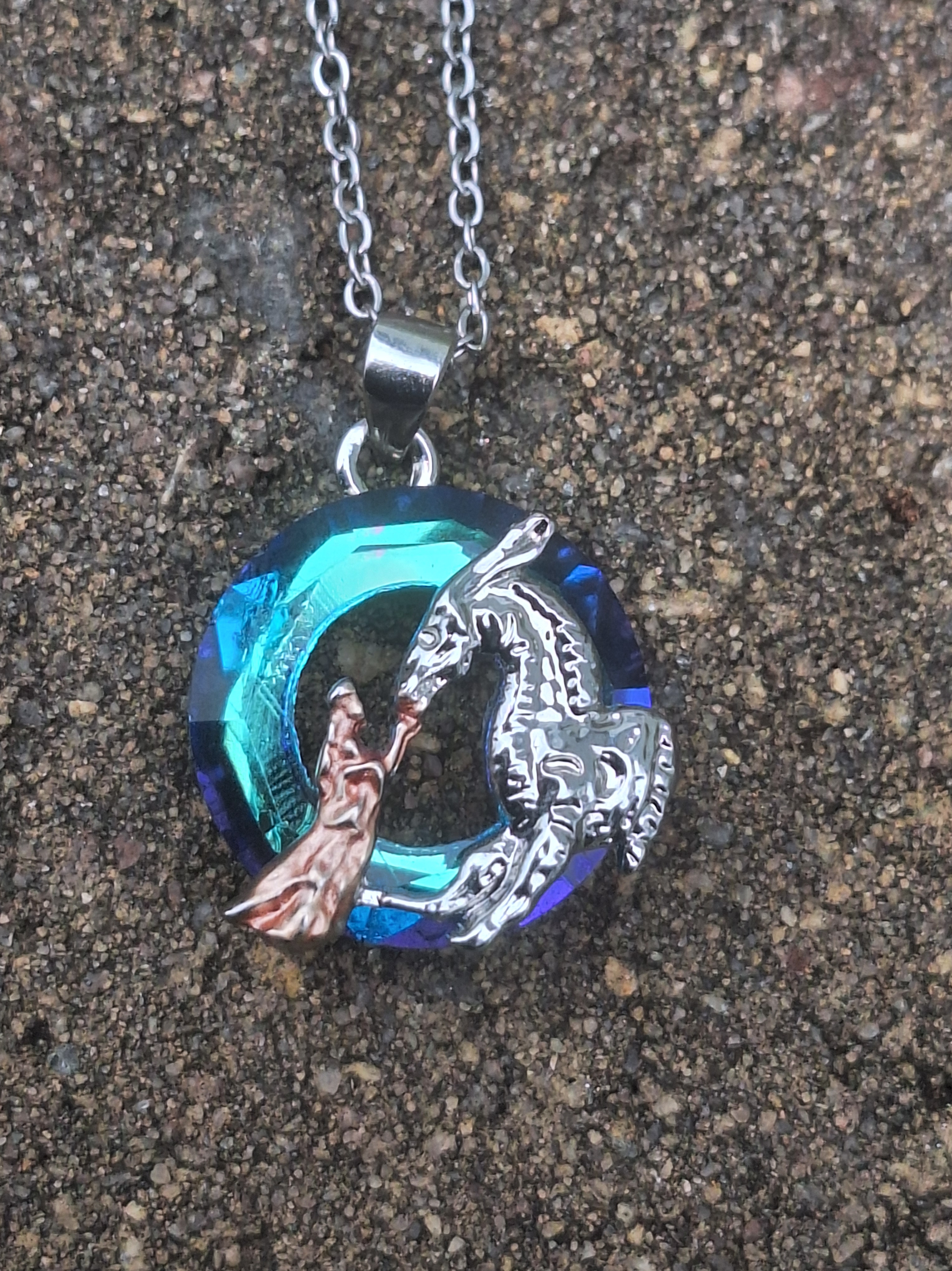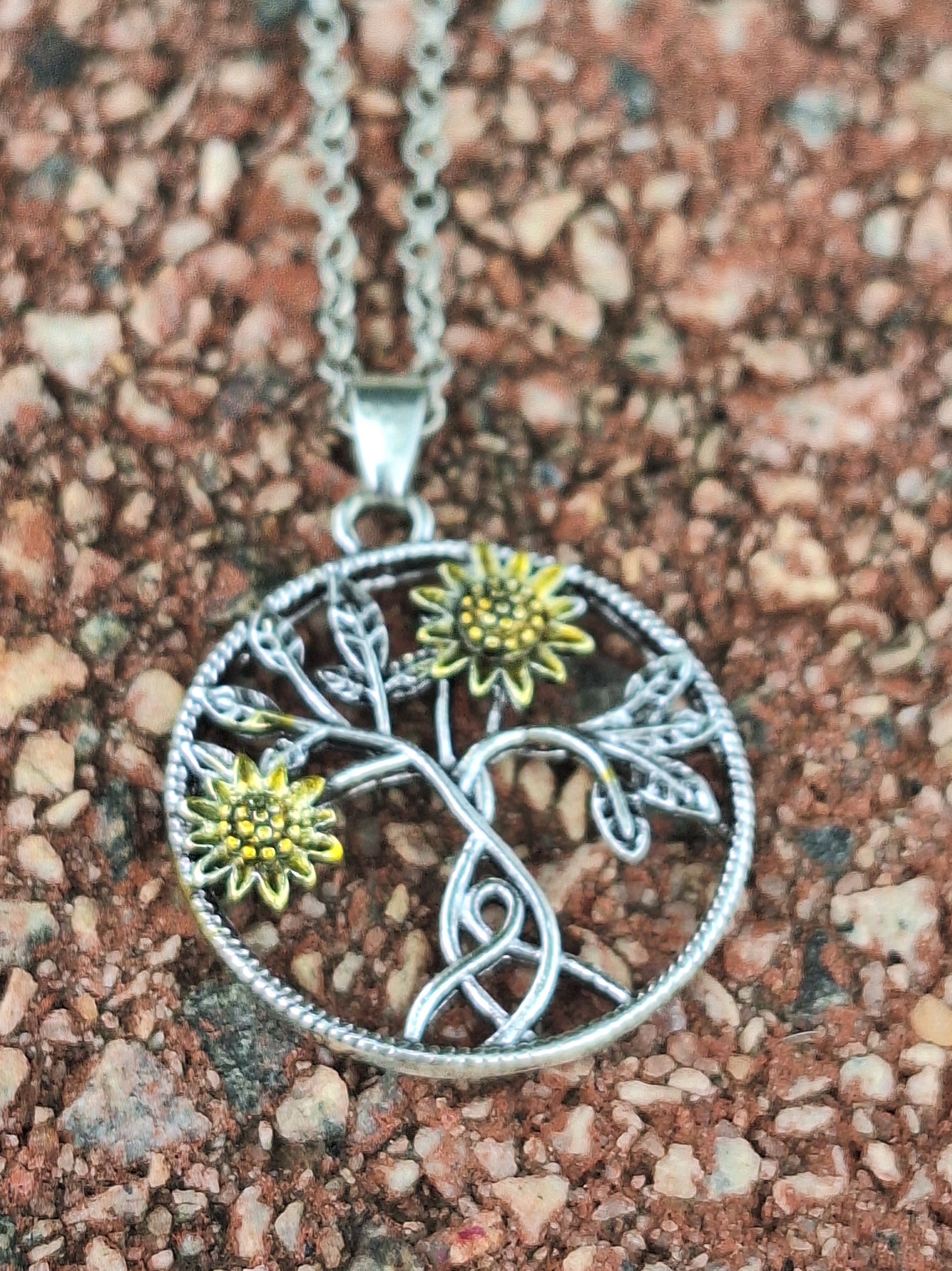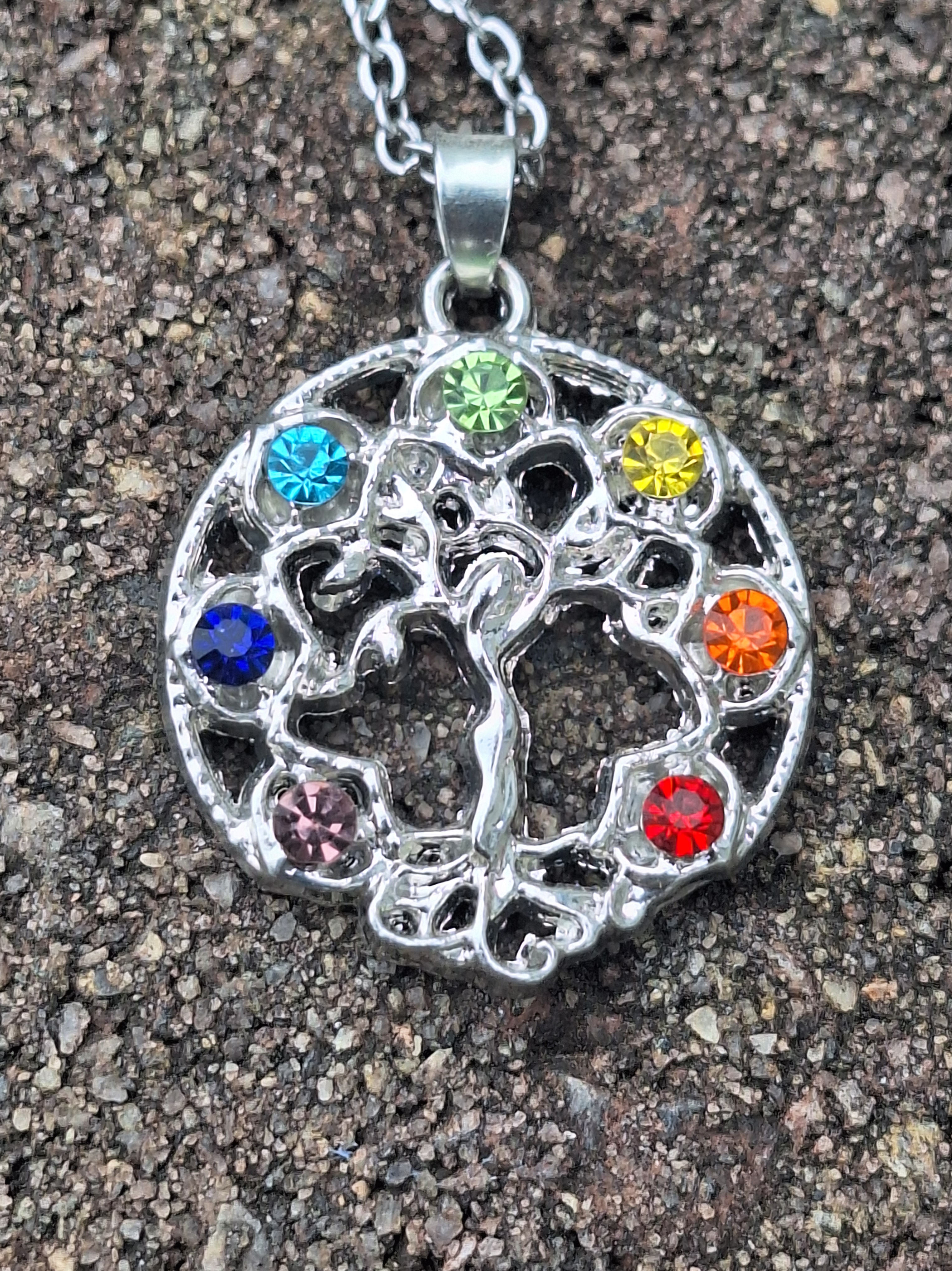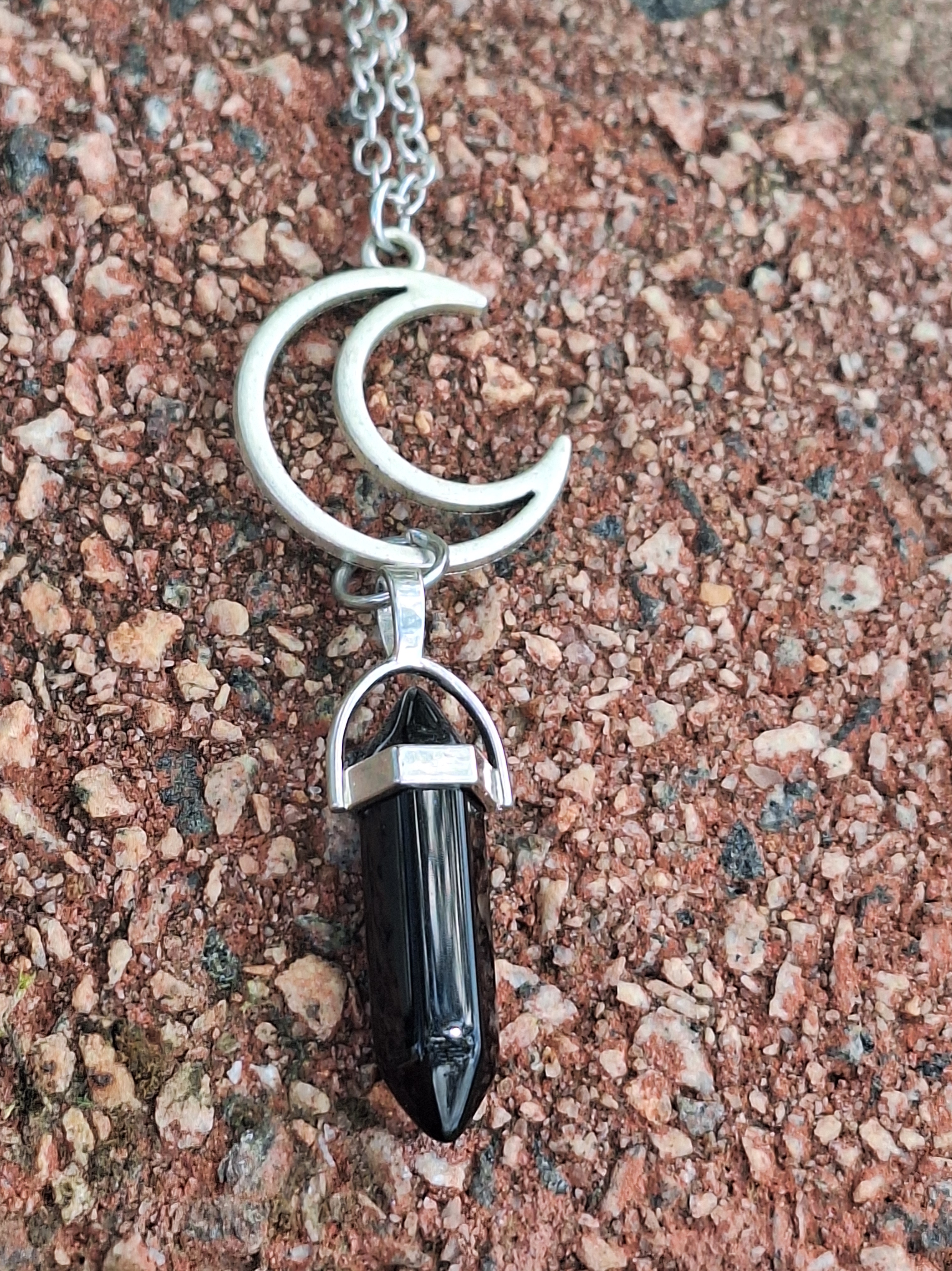 Purple/blue toned gem on a half moon with tree of life details. Pendant and chain included