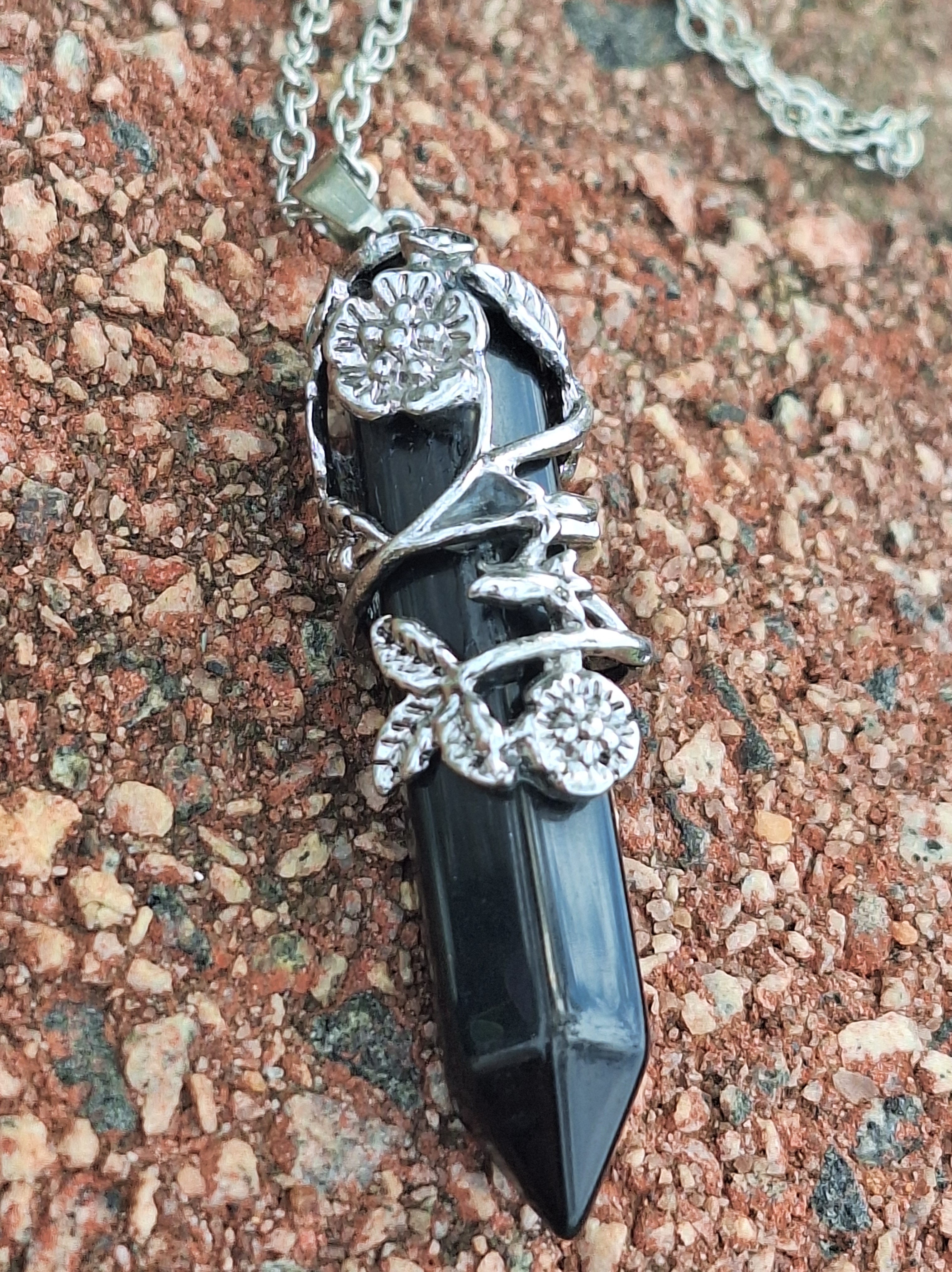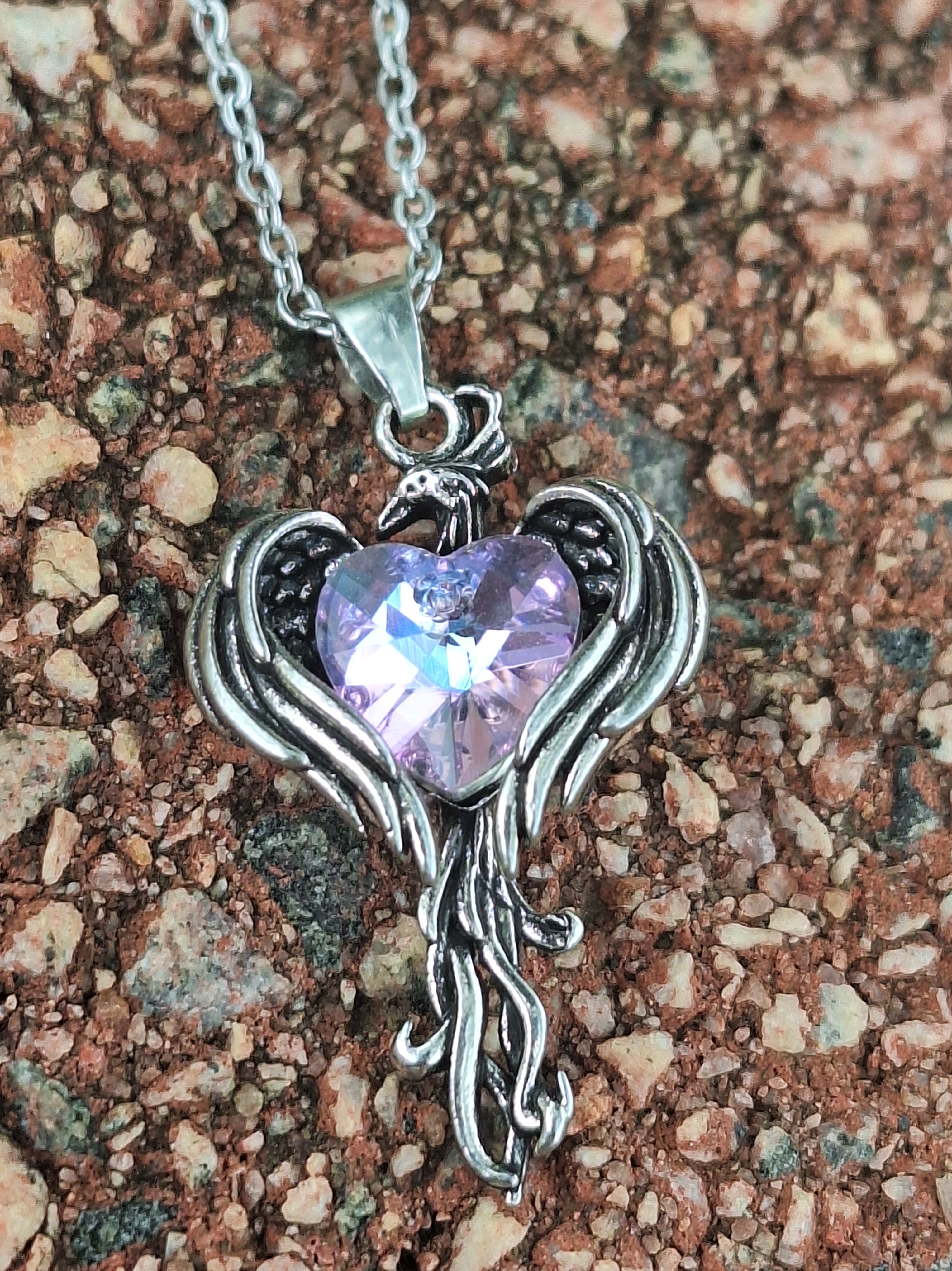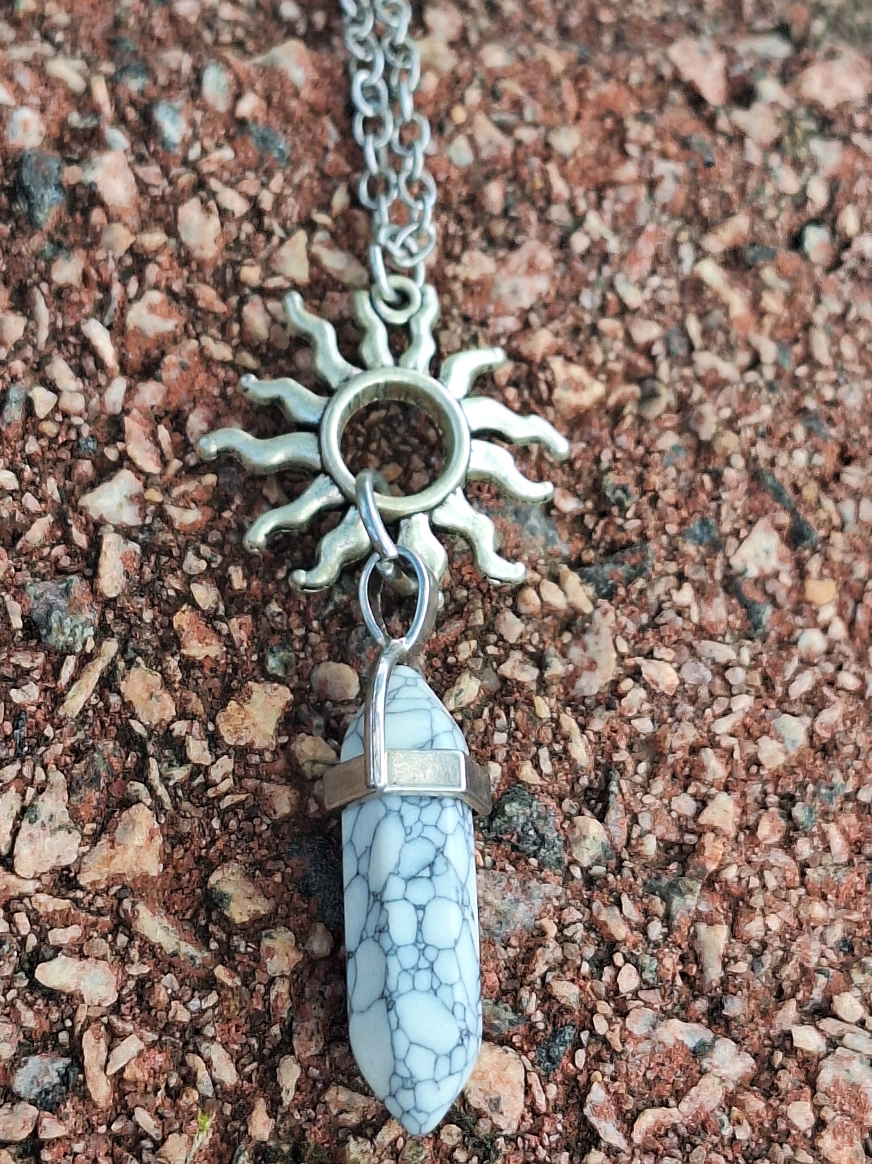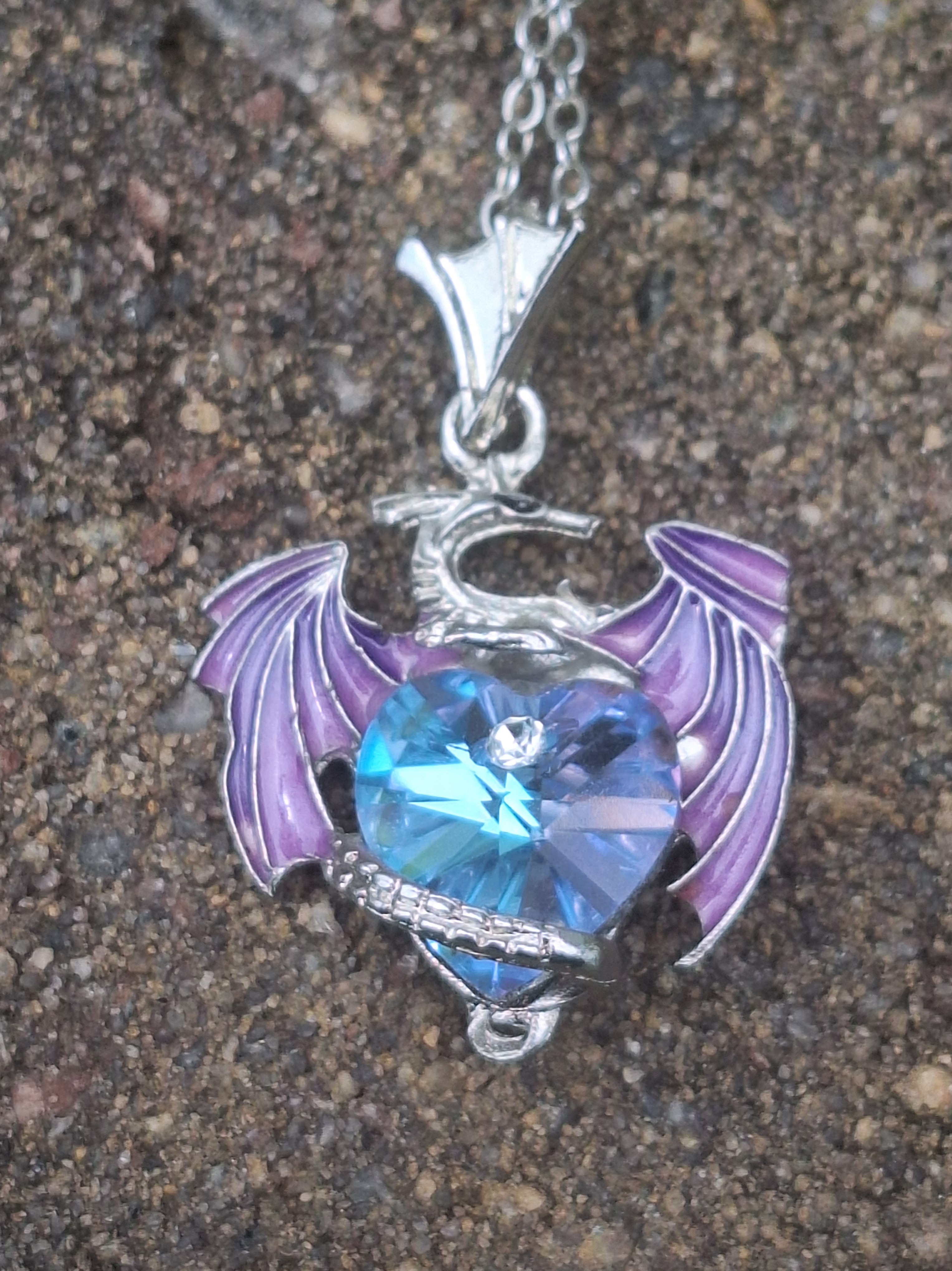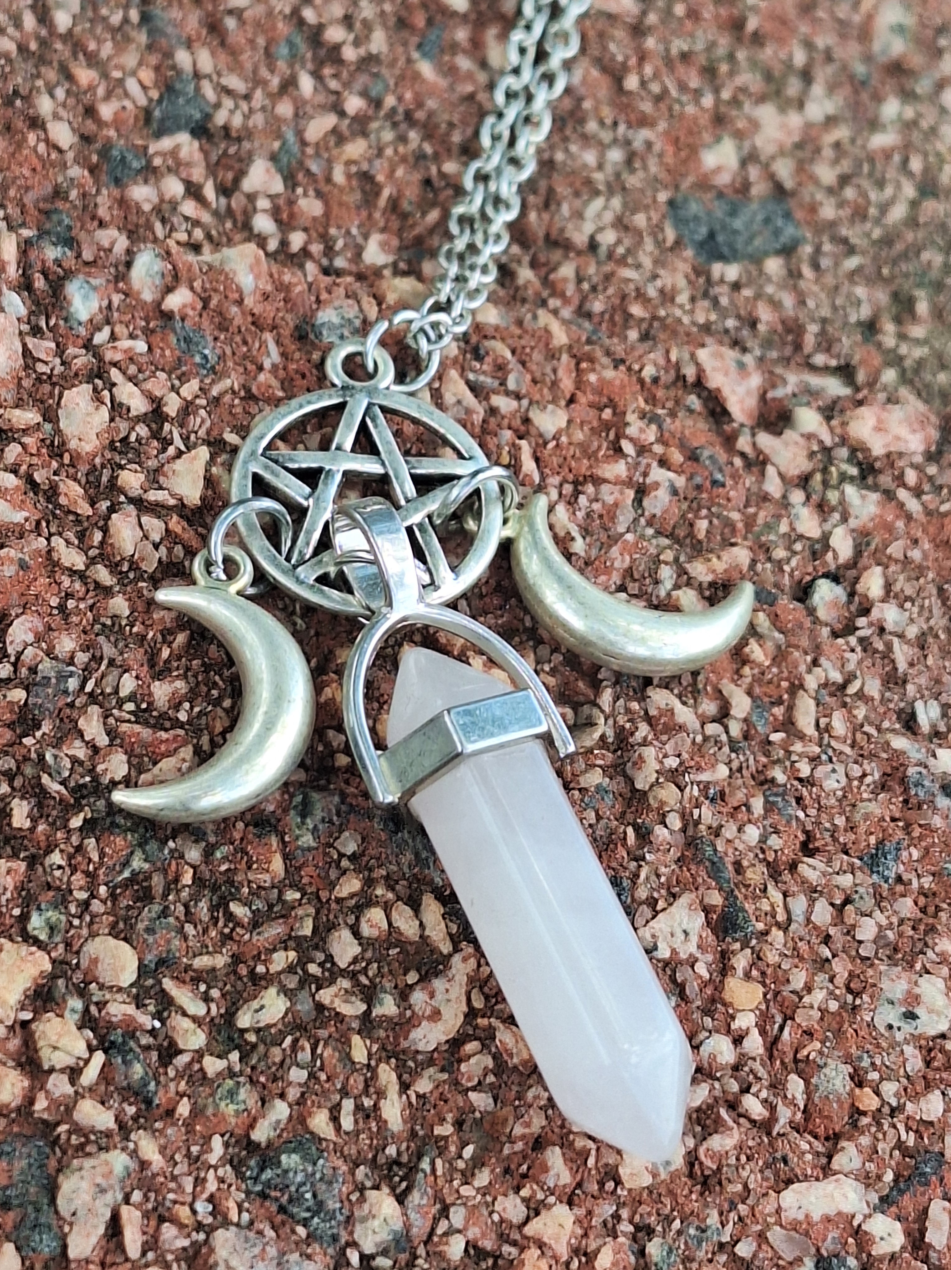 Purple/blue toned gem on a half moon with tree of life details. Pendant and chain included