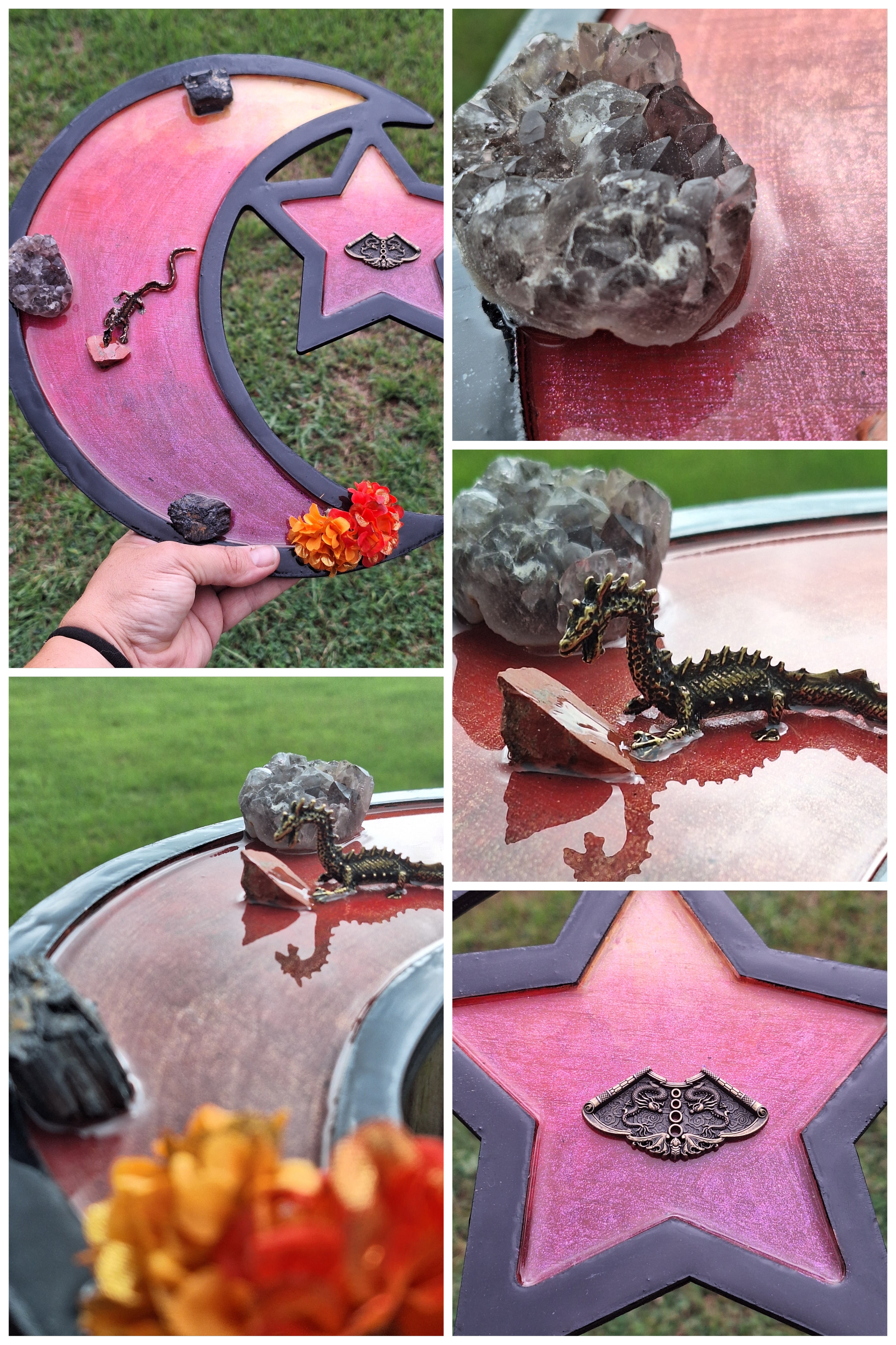 Handmade, painted, and designed by Krystle. Featuring a peaceful scene, sodalite crystals to enhance peace, jasmine, rose buds, and a brass incense holder.