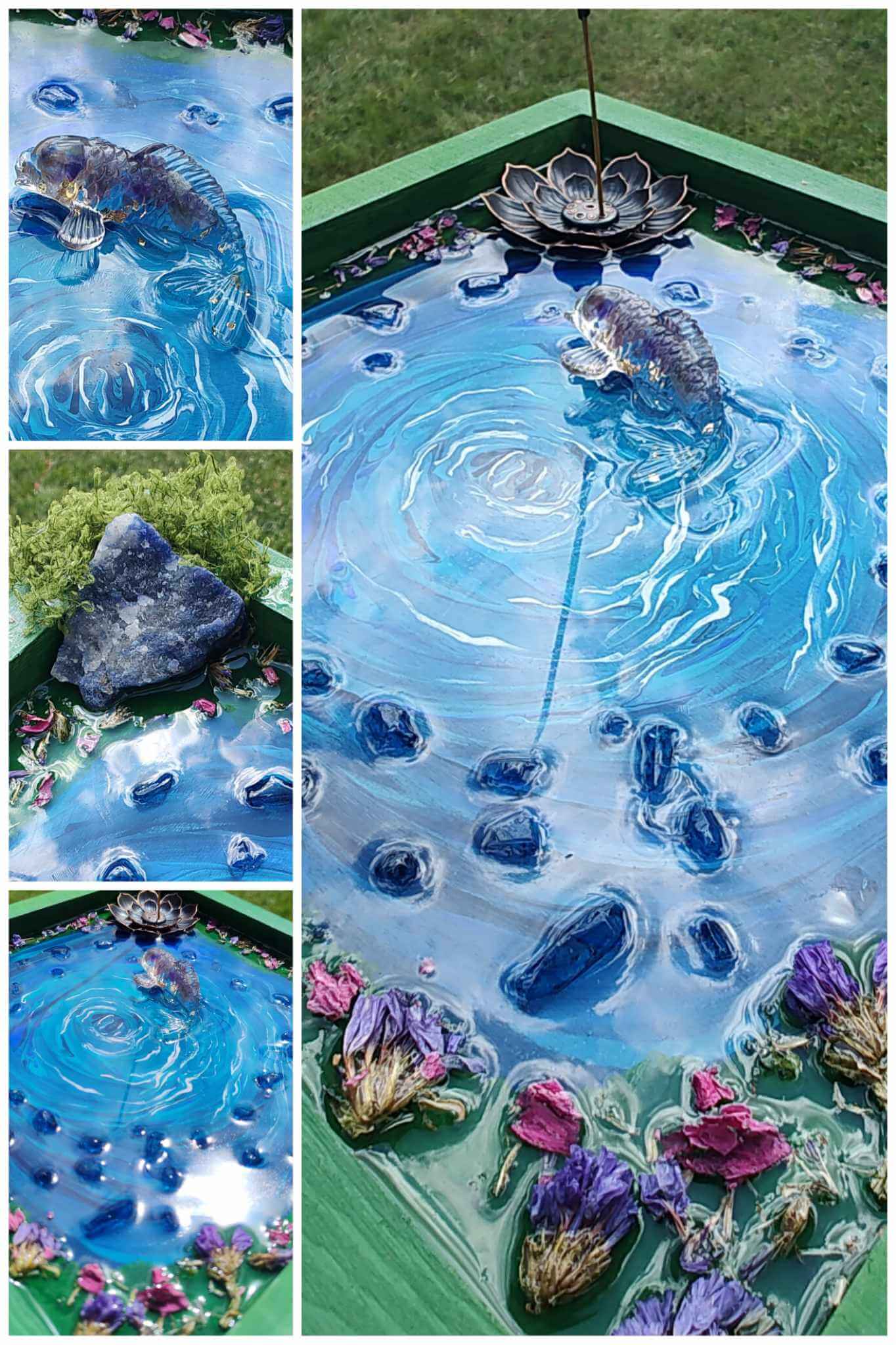 Handmade, painted, and designed by Krystle. Featuring a peaceful scene, sodalite crystals to enhance peace, fish, jasmine, rose buds, and a brass incense holder.