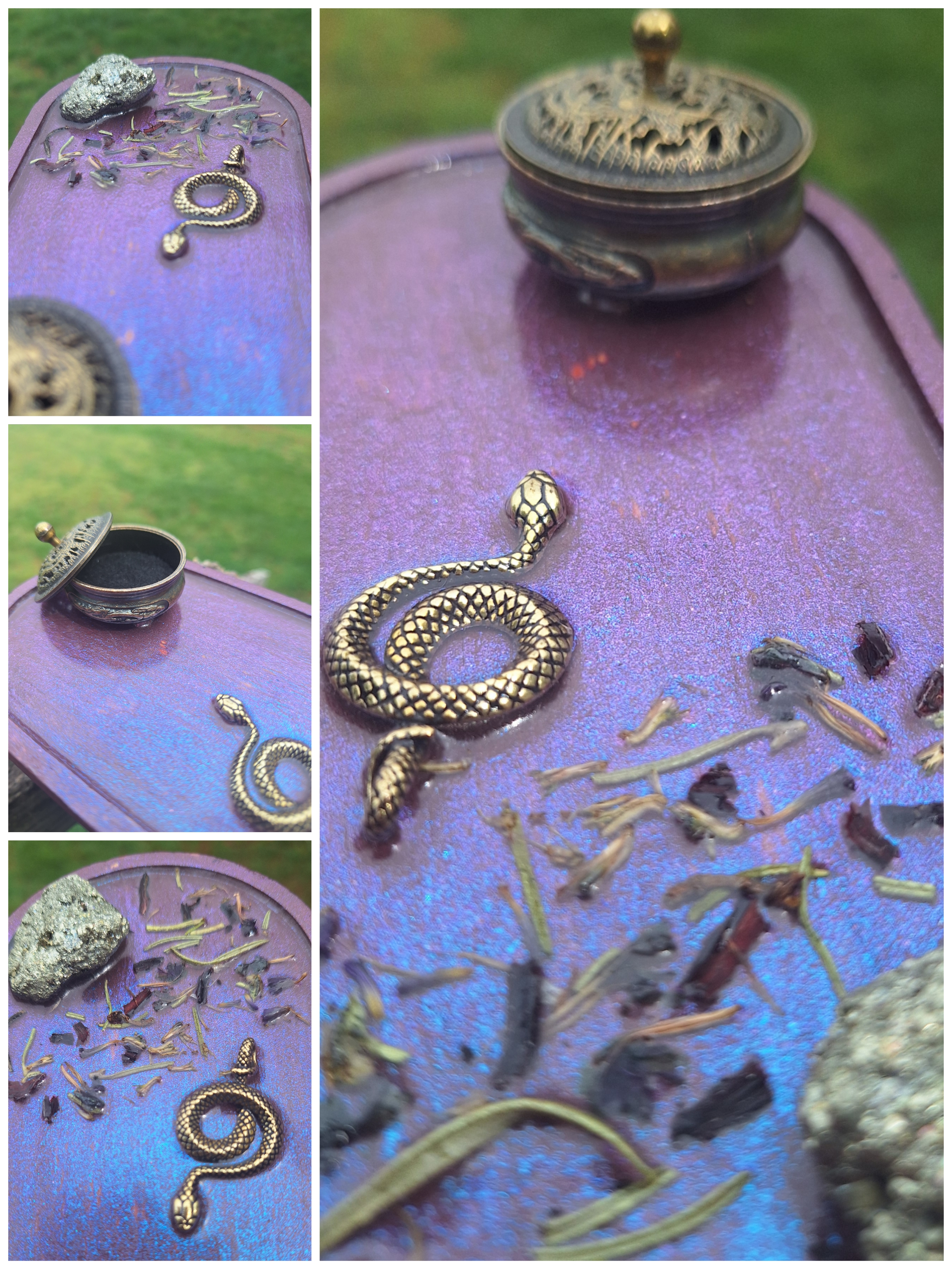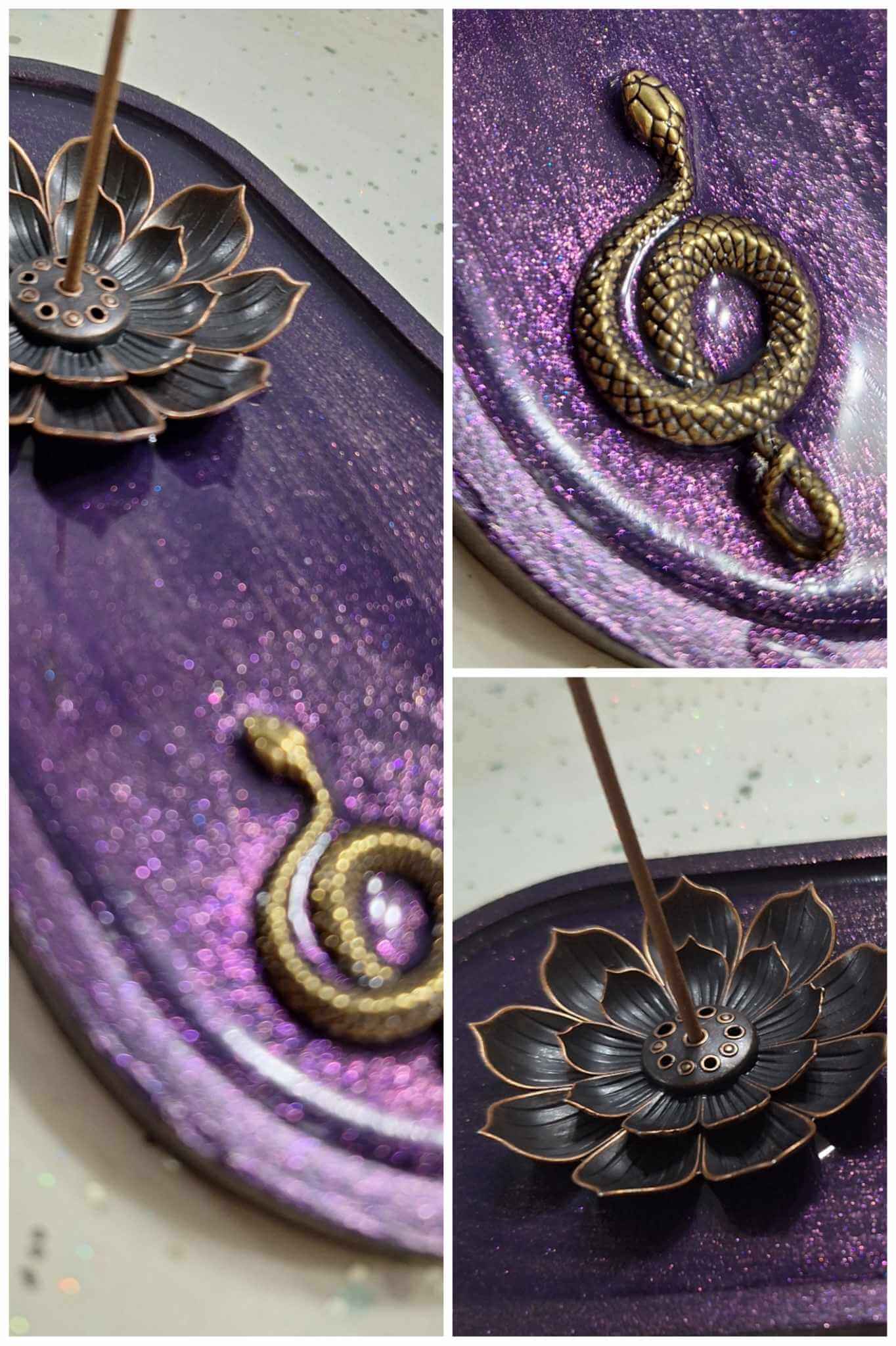 Featuring a 3d snake print, paired with brass lotus flower incense burner. Painted a shimmering purple to heighten crown chakra awareness.