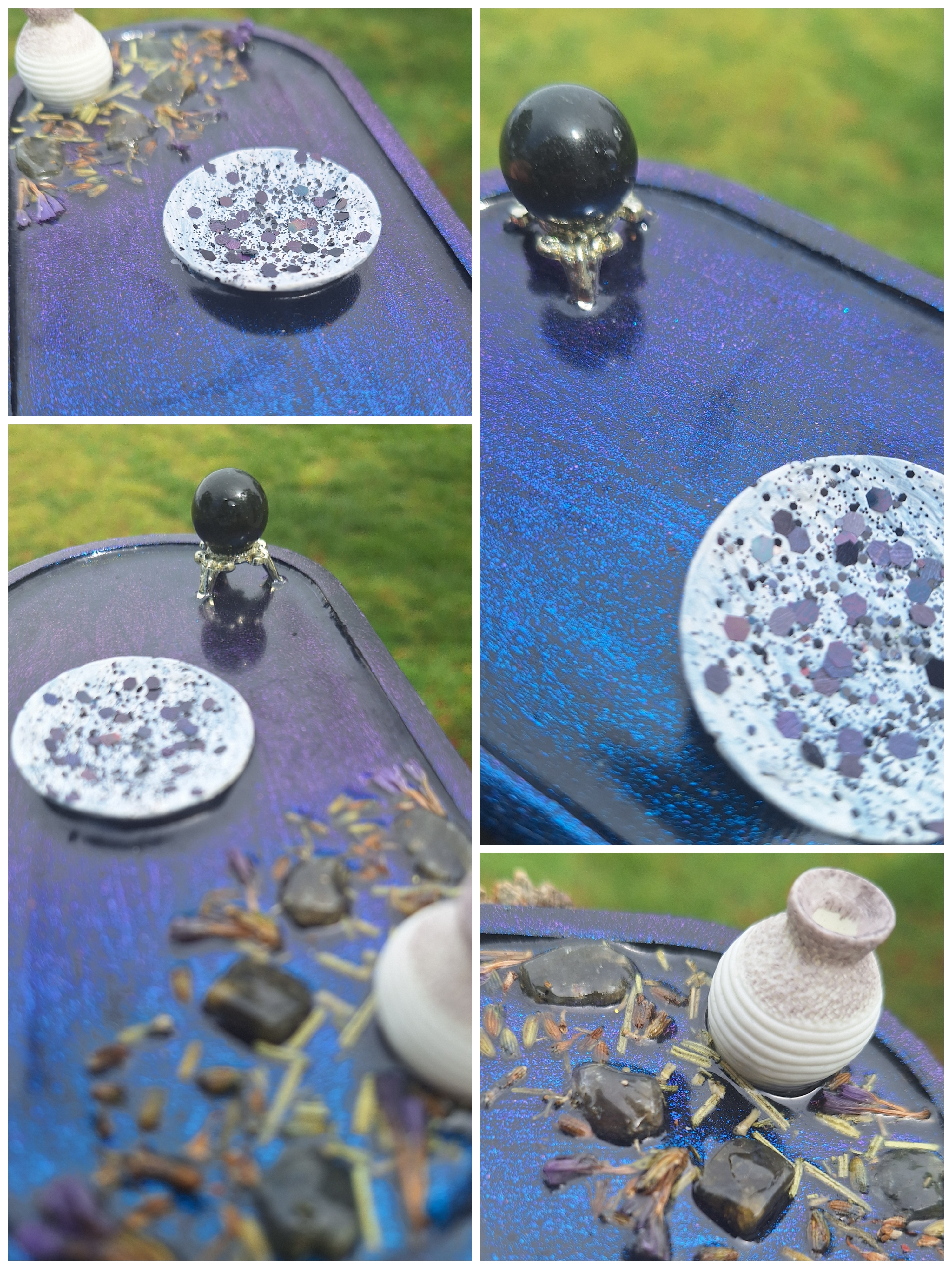 Featuring an Obsidian stone, incense vase, miniature offering plate on a handpainted tray. Full of magic, enhanced with Obsidian stones to amplify your magic.
