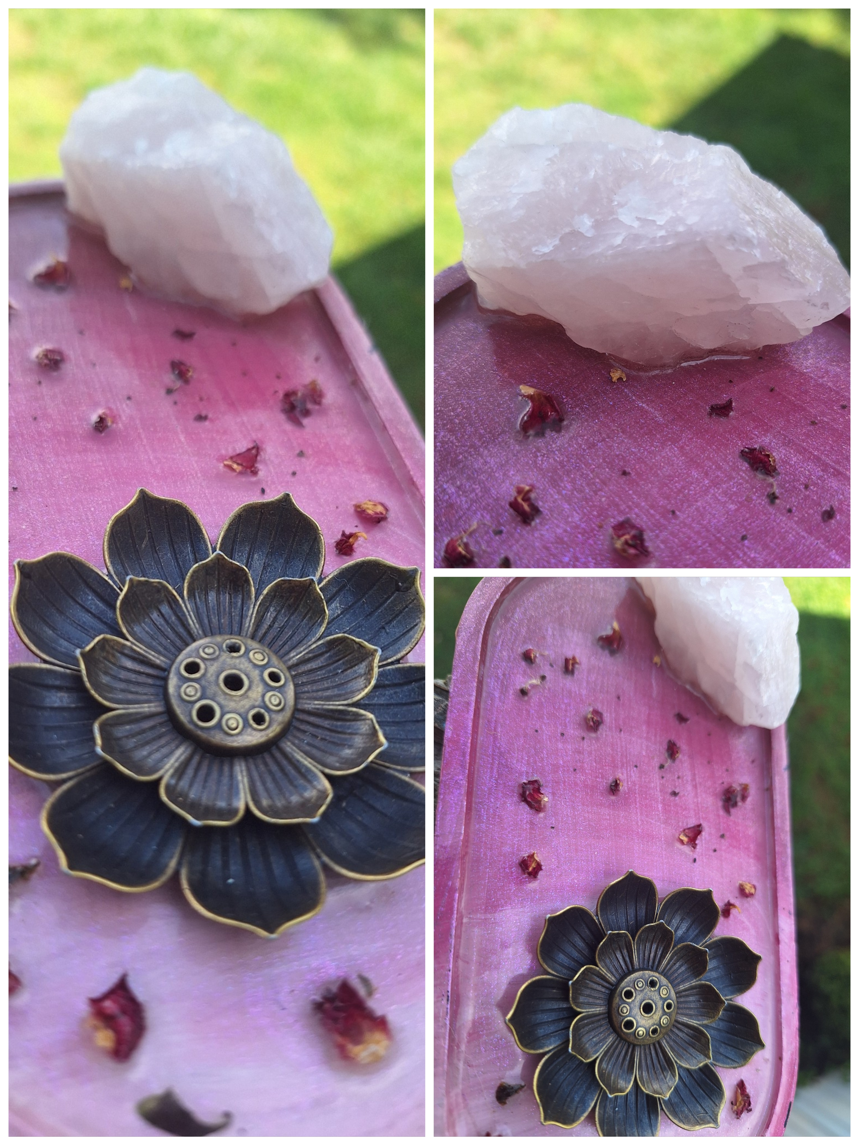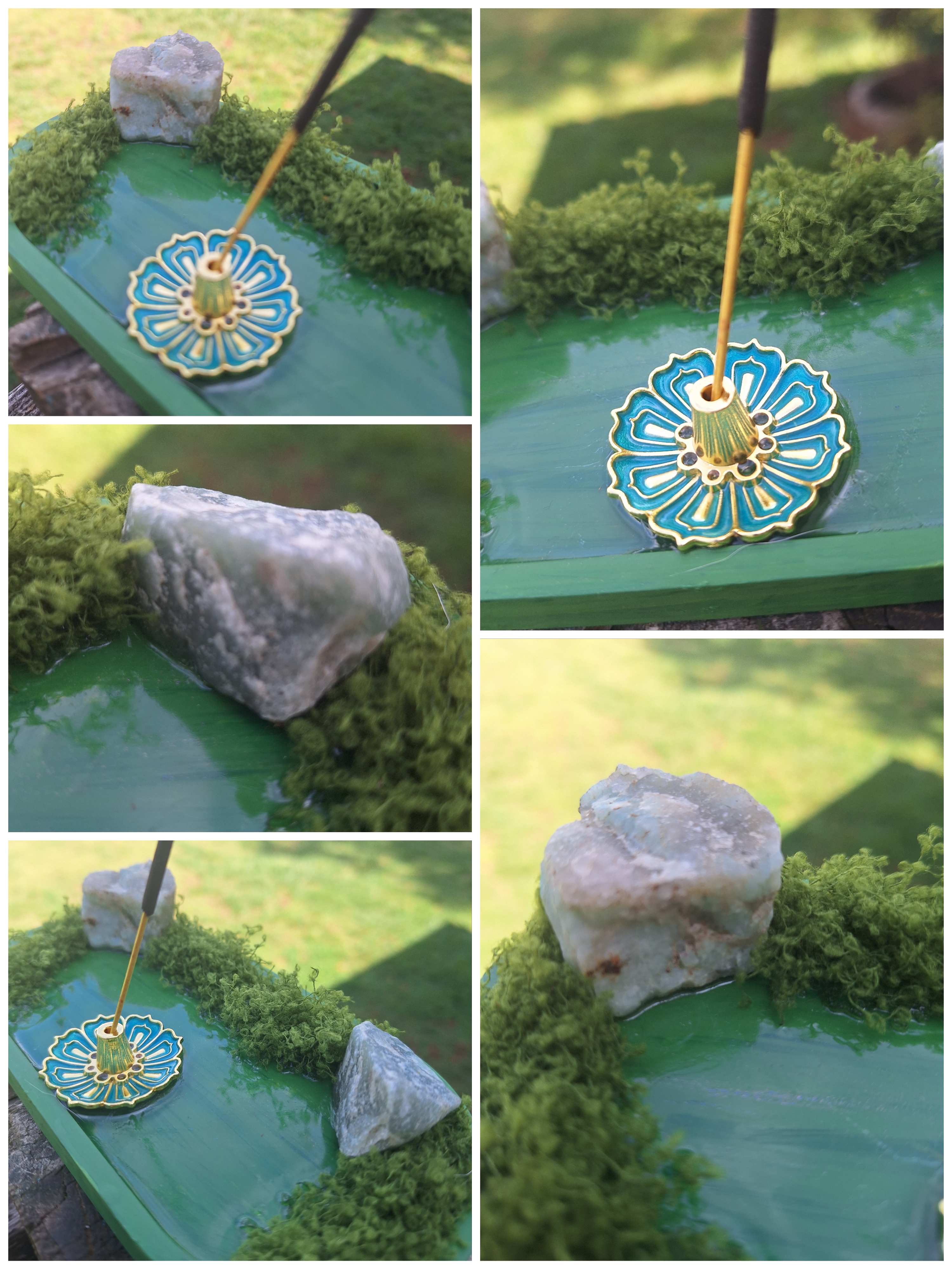 Unique incense tray featuring a peaceful scene of flowing water, green nose, a shimmering land, brass lotus flower incense holder, sodalite, adventuring crystals, and a unique plate.